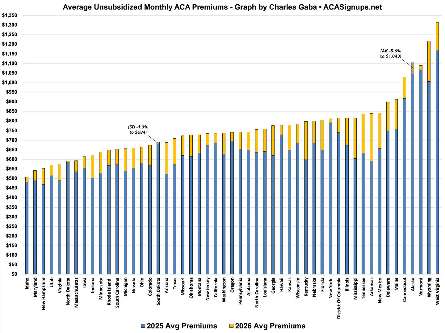 - Two states actually saw average decreases: Alaska dropped 5.6% (vs the projected 1.1%), while South Dakota dropped 1.0% (vs. a projected 6.4% increase).