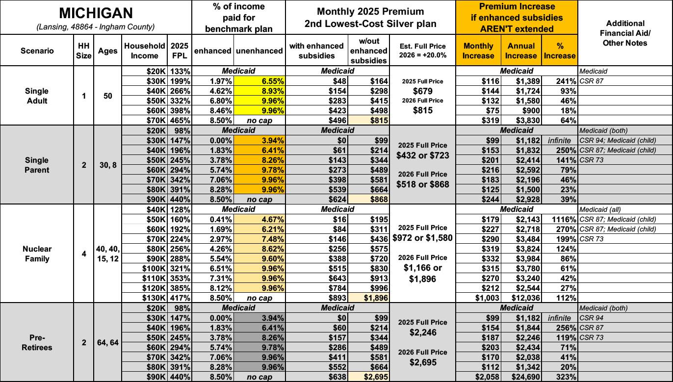Michigan has around 531,000 residents enrolled in ACA exchange plans, 91% of whom are currently subsidized. I estimate they also have another ~64,000 unsubsidized off-exchange enrollees.