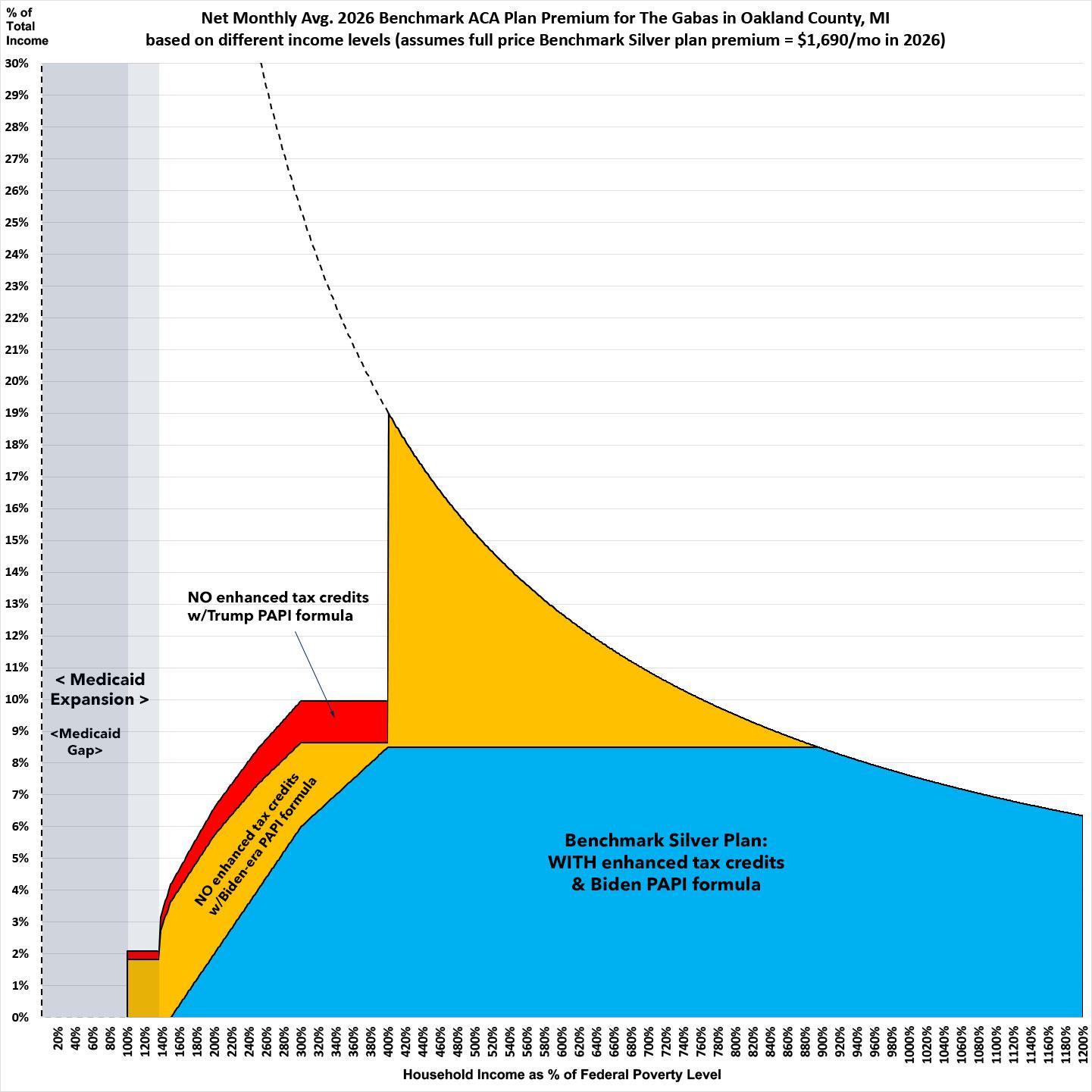 Here's what this looks like visually using my own family as an example here in Oakland County, Michigan. This assumes that the 2025 benchmark Silver plan, which currently costs $1,445/month at full price, increases by 17% (the statewide average for Michigan) to $1,690/month.