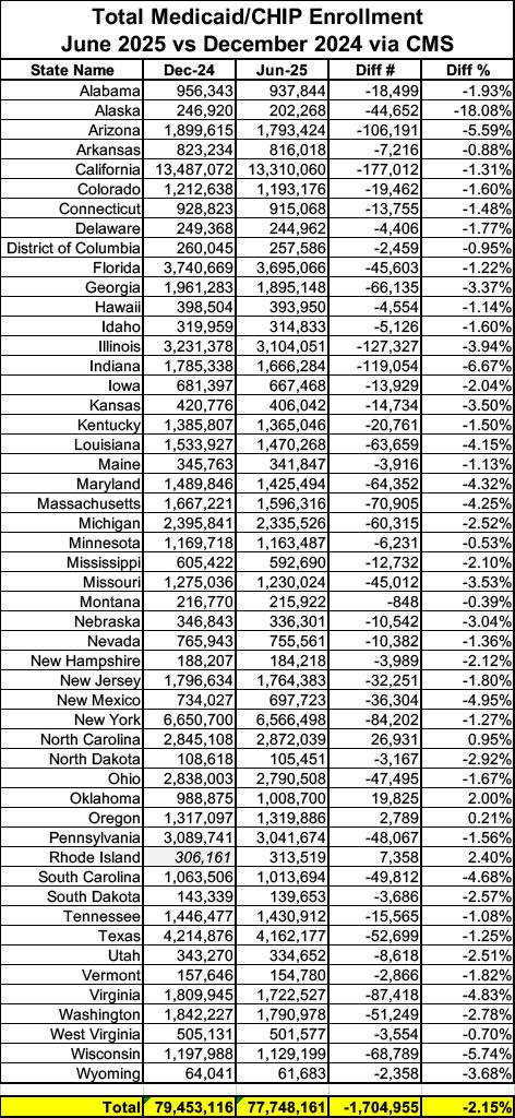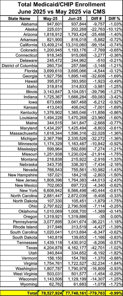 Between December 2024 and June 2025, net Medicaid/CHIP enrollment has dropped by around 1.7 million, or 2.2%, for whatever that's worth.