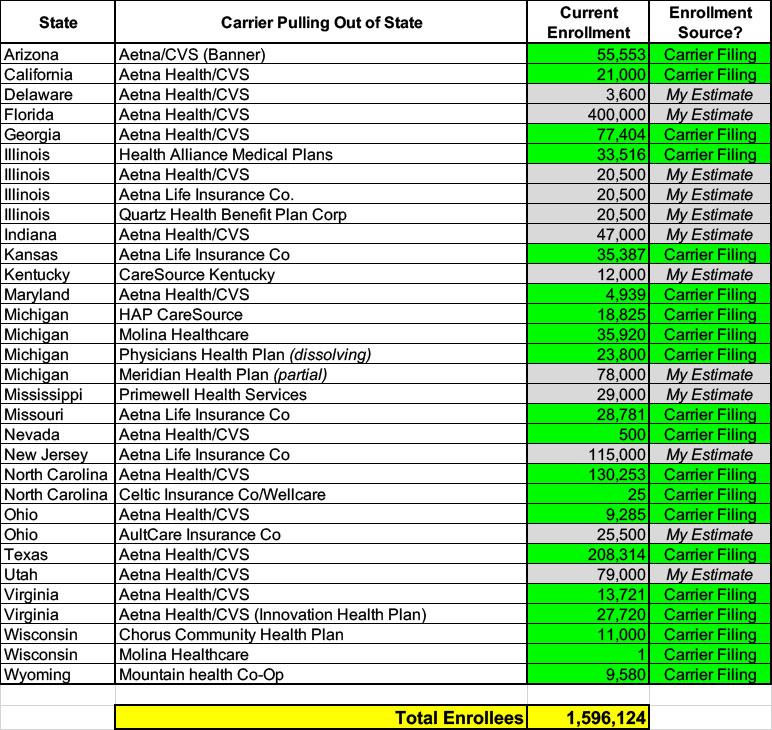 Aetna/CVS and its subsidiaries alone, which are pulling out of all 17 states they currently participate in, make up over half the list as well as a good 3/4 of the enrollees below (around 1.6 million people total).