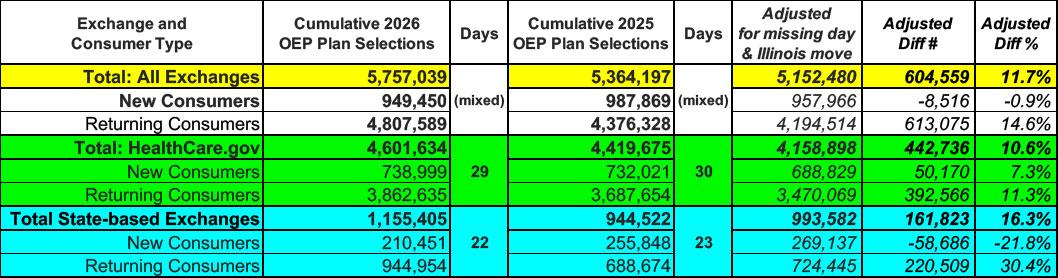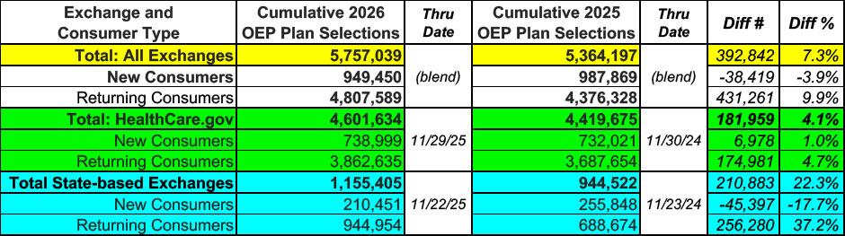 Breaking: Trump CMS posts claimed 2026 Open Enrollment Snapshot Report: 5.76M QHP selections, *up* ~11% y/y (adjusted) so far