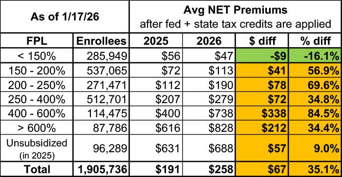 It's also worth noting that those state subsidies for the < 150% crowd came at a price: Most of the funds for it actually came from an existing program which wiped out subsidies for most enrollees the past few years, which means that in 2026...