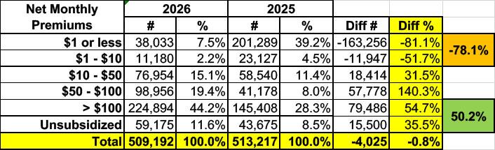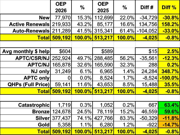 New enrollments are down 31% year over year, but this was mostly made up for by existing enrollees re-enrolling for 2026...with a dramatic increase in the number who actively selected a new policy this year, thankfully. Overall enrollment ended up only down about 0.8%, although again, there's a huge difference between the number of plan selections during Open Enrollment and actual effectuated enrollment over the course of the year.