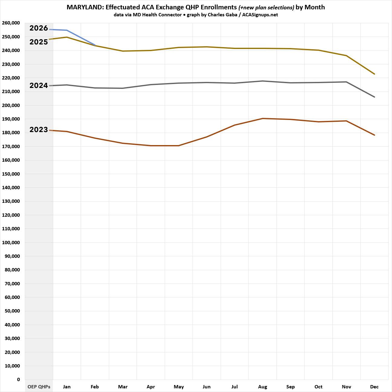 First, here's Maryland. While I have effectuated enrollment data for every year dating back to 2016 for every state, in Maryland's case their reports use a slightly different methodology than CMS: While the official CMS reports only include actual effectuated enrollees, Maryland's monthly enrollment reports include effectuated enrollees "...plus all new plan selections as of the last day of the month."