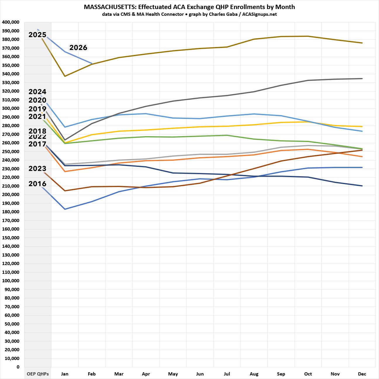 Unlike Maryland, the monthly enrollment data reports from the MA Health Connector appear to only include actual effectuated enrollees (the numbers from 2025 are slightly different from the CMS reports but only nominally so for the most part). That means I should be able to use the CMS data dating back to January 2016, like so: