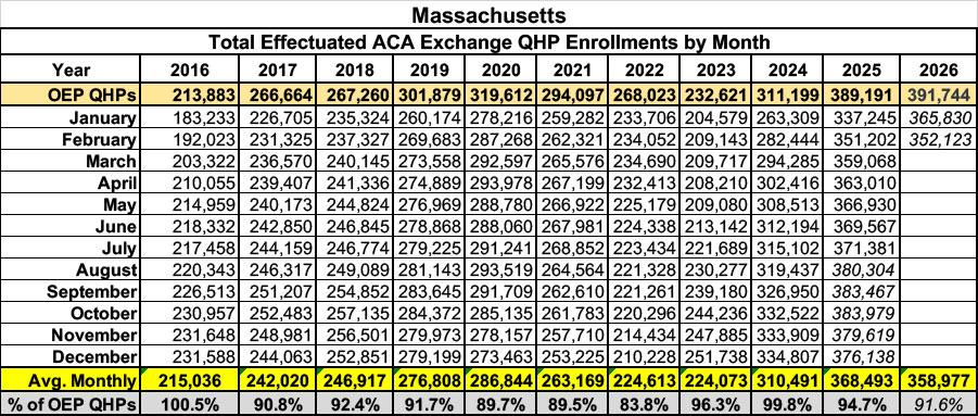 Again, while initial OEP plan selections were higher in 2026 than 2025 (only slightly so this time), as of February they've dropped off to virtually the same level they were at as of a year earlier. The question of whether or not effectuations will continue to drop or will instead increase over time is harder to project in Massachusetts, however, due to the Bay State's unusual "ConnectorCare" program, which not only provides generous supplemental subsidies to enrollees, but which also offers year-round enrollment for most enrollees: