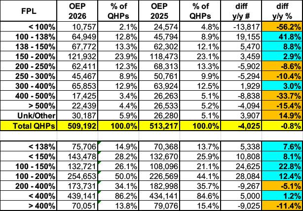 In New Jersey's case, as noted in the press release, they provide a hard dollar amount per month for enrollees earning up to 600% of the Federal Poverty Level (FPL), ranging from $20 - $100/month per enrollee. The table below shows the year over year plan selection (not effectuated enrollment) change at different income brackets...enrollment basically fell off a cliff below 100% FPL (mainly due to the Trump Regime banning documented immigrants living in the U.S. for less than 5 years from federal subsidy eligibility), and also dropped substantially over the 400% FPL threshold due to that population also no longer being eligible for tax credits.