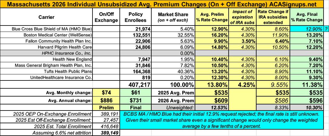 NOTE: Massachusetts has their own state-based subsidy program called "ConnectorCare" for lower-income enrollees; I'm not sure how this will be impacted by the IRA subsidies expiring or the "Integrity Rule" changes.
