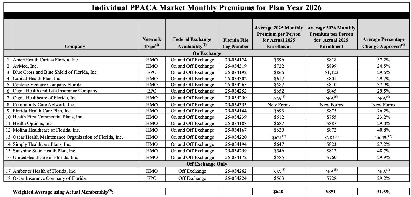 UPDATE 10/17/25: Oh for heaven's sake. It turns out that the Florida Office of Insurance Regulation (FLOIR) quietly published their final/approved 2026 rate filings for the individual market over two months ago and I didn't find out about it until now! A big shout-out to "techbud251" in the comments for alerting me to this PDF buried in the FLOIR website, with the final column labeled "Average % Change Approved."