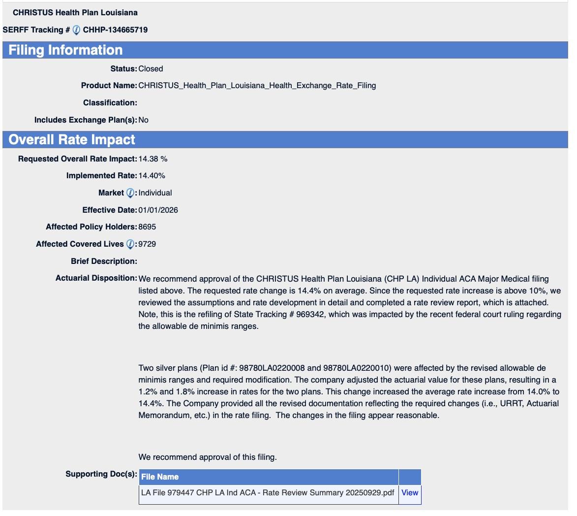 UPDATE 10/20/25: Thanks to Louise Norris for giving me the heads up that CHRISTUS isn't dropping out of the Louisiana ACA market after all; here's their final listing: