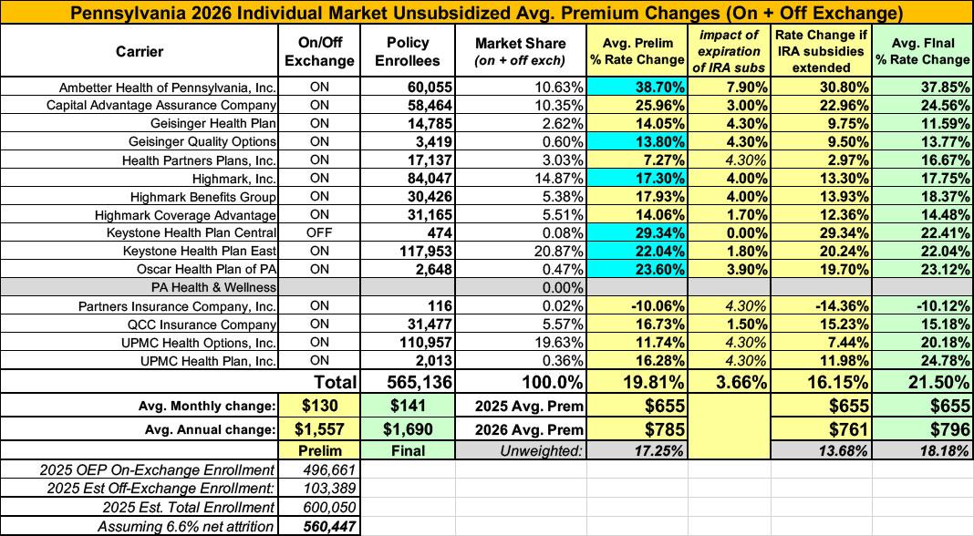 For carriers which don't publicly clarify how much the IRA subsidies expiring are impacting unsubsidized rate changes I'm substituting the CBO's projection of 4.3% for 2026 from last December.